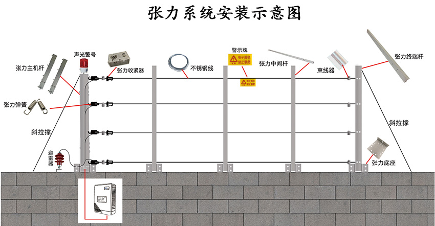 現在來說下張力電子圍欄,前面也說瞭(le)張力圍欄和脈沖圍欄最大的區别就是張力圍欄不具備有高壓脈沖電擊功能,報警和阻擋同樣具備瞭(le)。張力圍欄的報警方式是當前端的圍欄的拉力值發生瞭(le)改變就會産生報警信号。由於(yú)張力圍欄是一種物理性的報警方式,所以張力圍欄的每個的防區控制長度就相對較短一般在40米以内爲一個防區。由於(yú)防區控制長度較短,在同周長的項目上整體的造價成本相比脈沖圍欄要高一些。